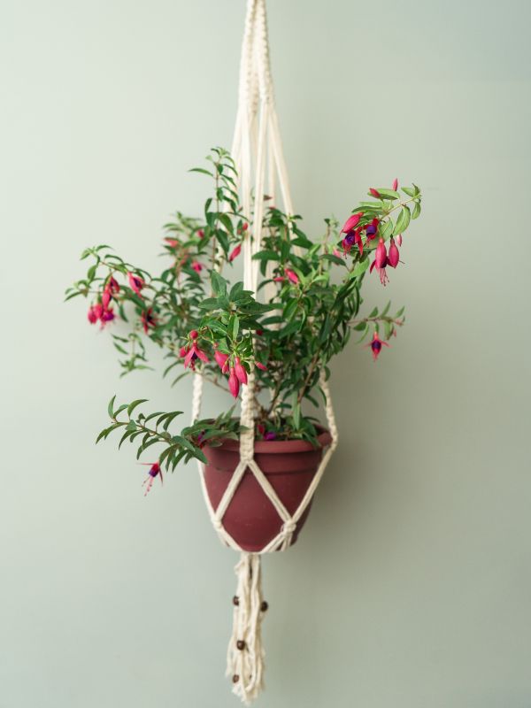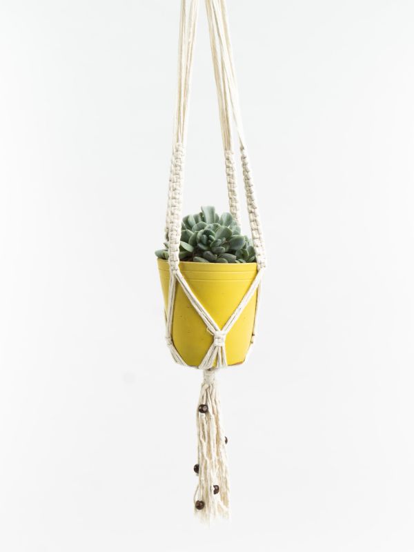 The flower pots made of cotton thread, with the macrame weaving technique.