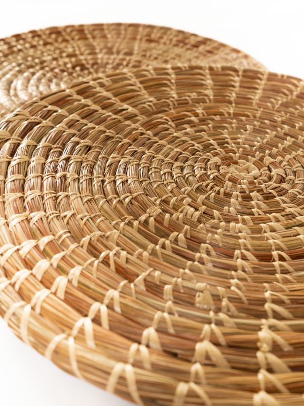 Individuales de pino recolectado en la sierra de las minas en Huite y San Diego Zacapa. Elaborados con la técnica del amarrado de pino, costurado a mano con rafia de colores.